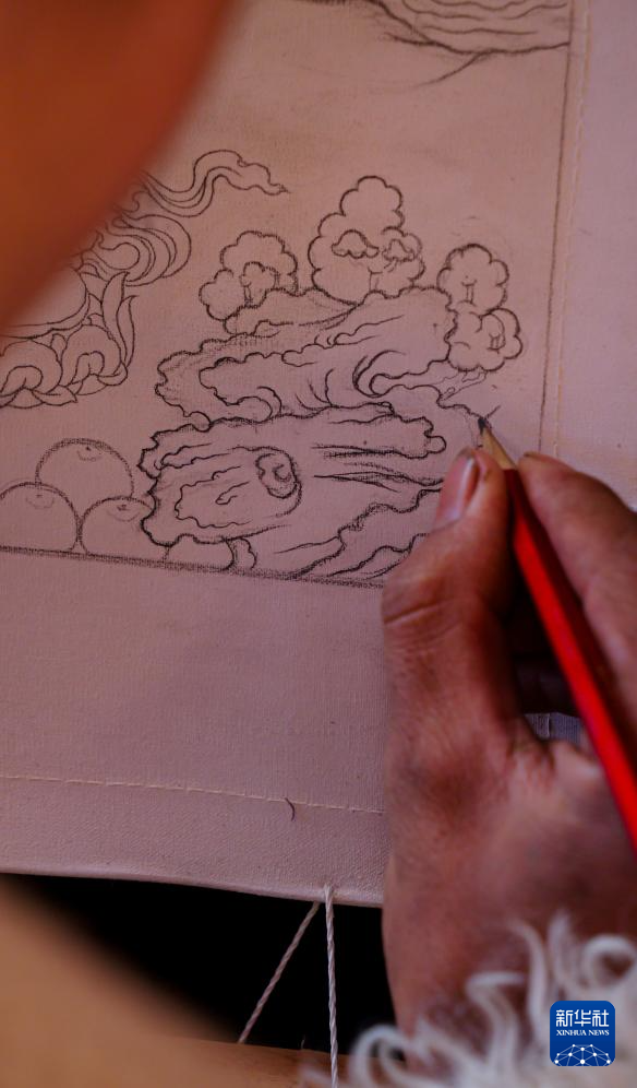 11月22日,昌都市丁青縣擁忠文化藝術中心非遺扶貧就業(yè)工坊學員在畫唐卡。新華社記者 格桑朗杰 攝