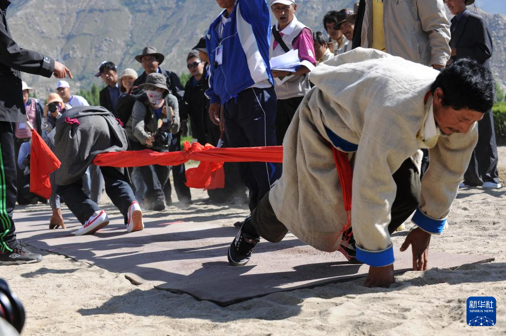 2011年8月30日,兩位來自拉薩農(nóng)牧區(qū)的群眾在雪頓節(jié)上進行押加比賽。新華社記者 文濤 攝