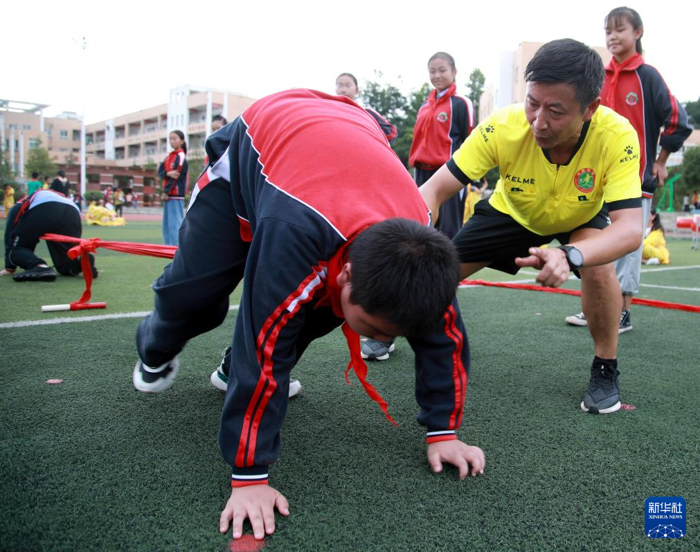 2020年9月9日,貴州省遵義市余慶縣敖溪小學(xué)的體育老師任達武(右)指導(dǎo)學(xué)生押加的技術(shù)要領(lǐng)。新華社記者 劉續(xù) 攝