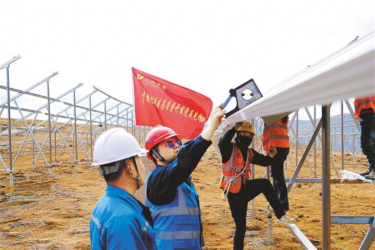 圖為華電西藏才朋光儲(chǔ)二期項(xiàng)目黨員先鋒隊(duì)的黨員們?cè)谑┕がF(xiàn)場(chǎng)進(jìn)行維護(hù)作業(yè)。 記者 袁海霞 鄭璐 攝