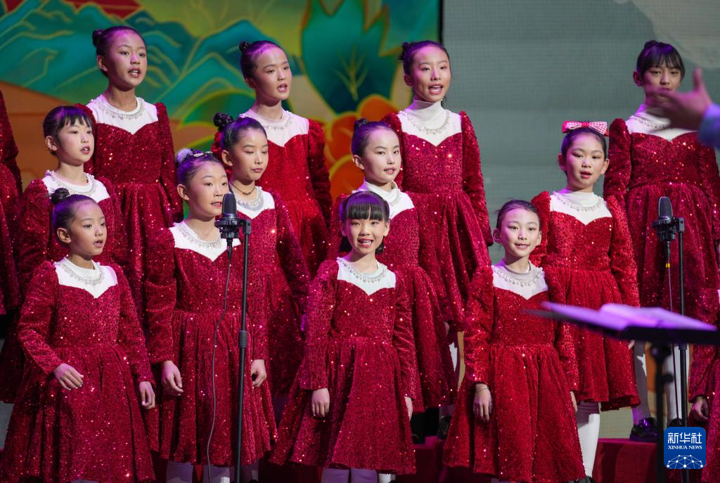 12月28日晚,西藏珠峰少年合唱團(tuán)學(xué)員代表合唱歌曲《快快走唱首歌》。新華社記者 晉美多吉 攝
