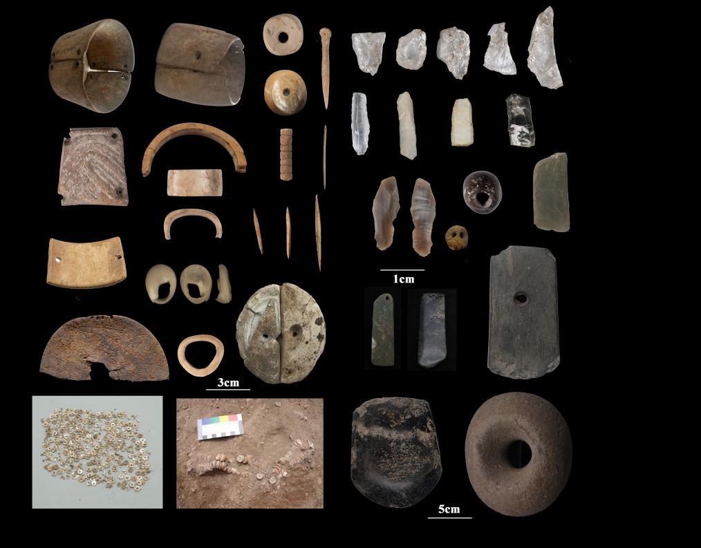 瑪不錯遺址第一期出土遺存典型骨器、石器、蚌器、滑石珠等。(圖片由西藏自治區(qū)文物保護研究所提供)