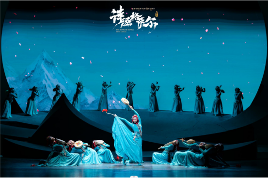 在創(chuàng)作過程中,團(tuán)隊深度挖掘《詩經(jīng)》和《格薩爾》史詩經(jīng)典代表作品的文化元素,在“同、融、美”方面狠下功夫。主創(chuàng)們深入挖掘兩部作品中相同、相似、接近的圖騰、樂器、歌舞、生活習(xí)性等文化元素 ,以《詩經(jīng)》采詩官與《格薩爾》史詩傳唱藝人作為明線,將“火、水、結(jié)”作為暗線,將這些文化元素有機(jī)串聯(lián)起來,再借助高科技數(shù)字手段呈現(xiàn)背景影像,實現(xiàn)了在“美美與共”的欣賞中,讓觀眾感知中華多民族文化的交往交流交融,表達(dá)了中華文化同宗同源的歷史,有力體現(xiàn)了多民族共鑄中華民族共同體意識的主題。