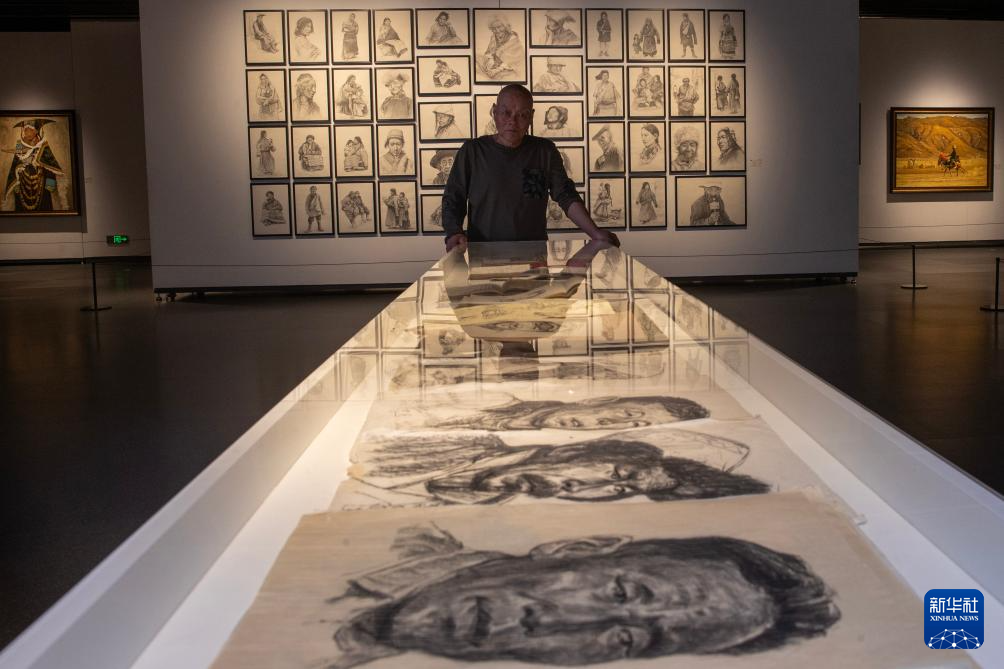 張鷹在西藏美術(shù)館觀看自己的畫展(5月13日攝)。新華社記者 姜帆 攝??