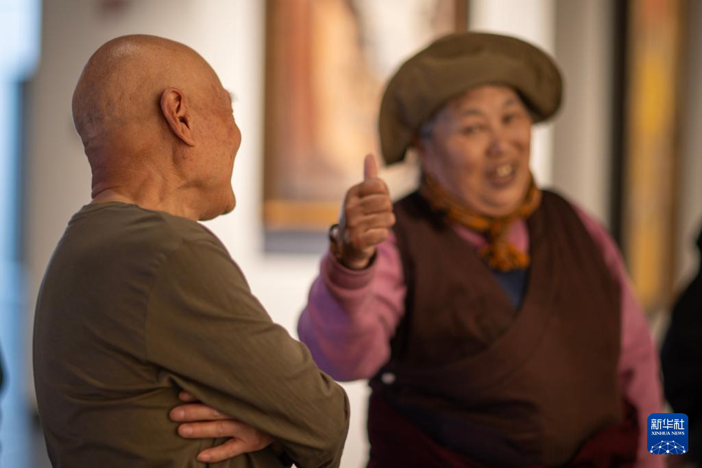 一位藏族觀眾在西藏美術(shù)館參觀張鷹的畫展時(shí)夸贊他的畫(5月13日攝)。新華社記者 姜帆 攝??