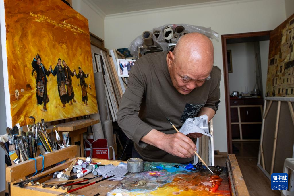 張鷹在拉薩的畫室作畫(5月13日攝)。新華社記者 姜帆 攝??