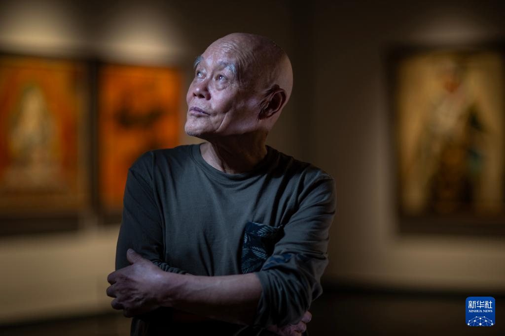 張鷹在西藏美術(shù)館自己的畫展上(5月13日攝)。新華社記者 姜帆 攝??