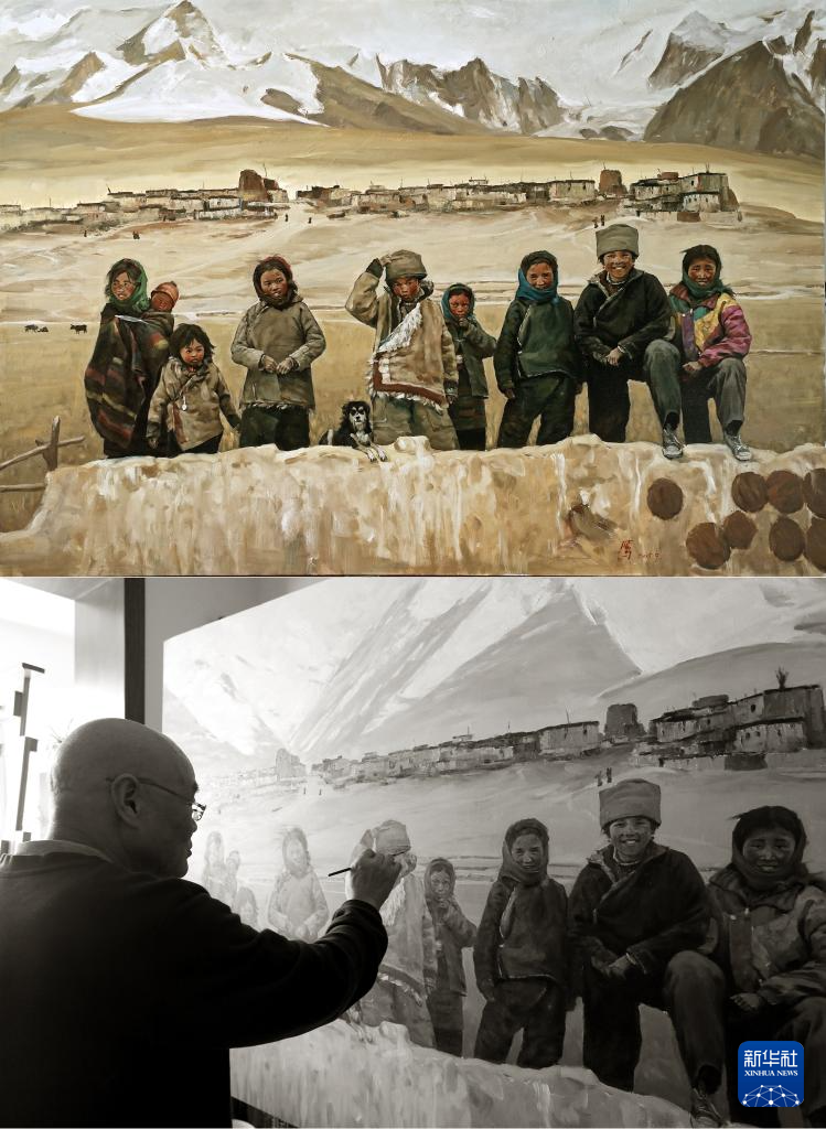 ?這是一張拼版照片,上圖為:張鷹的代表作之一《大山里的孩子》(受訪者供圖);下圖為:2015年,張鷹在拉薩的畫室創(chuàng)作《大山里的孩子》(受訪者供圖)。新華社發(fā)
