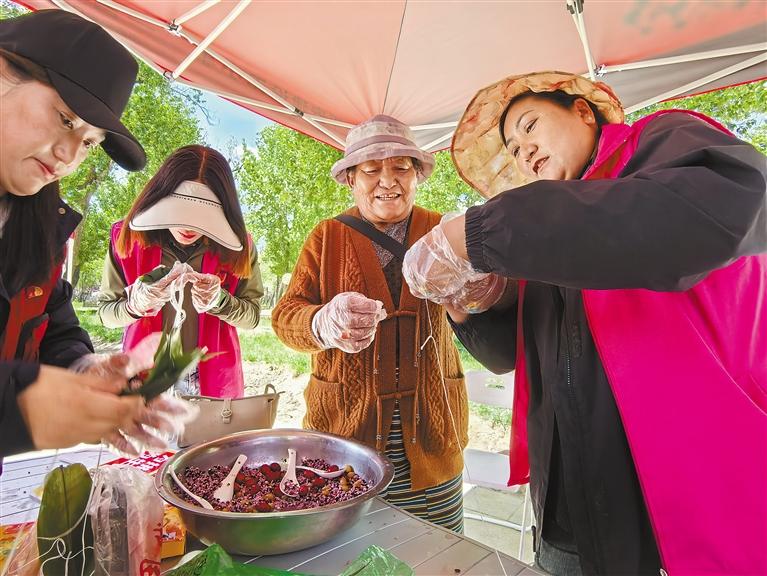 5月29日,日喀則市舉行喜迎西藏自治區(qū)成立60周年暨“我們的節(jié)日·端午”主題活動(dòng),以節(jié)日為媒,將鑄牢中華民族共同體意識(shí)宣傳教育融入傳統(tǒng)節(jié)慶。活動(dòng)中,自治區(qū)十佳宣講員平措用通俗易懂的語(yǔ)言,為現(xiàn)場(chǎng)市民群眾講述端午節(jié)的由來(lái)和美食、習(xí)俗等小知識(shí);志愿者們聲情并茂地誦讀《端午詠屈原》、《端午情懷》、《屈子頌》等經(jīng)典作品,贏得陣陣掌聲。市民群眾興致勃勃地參與旱地龍舟趣味小游戲、端午節(jié)知識(shí)有獎(jiǎng)競(jìng)答,包粽子、制香囊,在歡聲笑語(yǔ)中感受傳統(tǒng)文化的魅力。在定結(jié)縣扎西崗鄉(xiāng),災(zāi)后重建施工隊(duì)和村民代表歡聚一堂,頓珠次仁等群眾自發(fā)彈起扎念琴,施工隊(duì)代表也上臺(tái)傾情獻(xiàn)唱,其樂(lè)融融。在薩迦縣新時(shí)代文明實(shí)踐中心,歌舞、戲曲、小品等節(jié)目輪番上演,讓縣特困供養(yǎng)中心老人們享受到了一場(chǎng)視聽(tīng)盛宴。