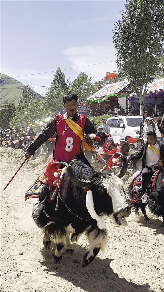 隨后登場(chǎng)的賽牦牛更是將氣氛推向高潮。這些被精心裝扮的牦牛,頭戴彩飾,頸掛銅鈴,在主人的駕馭下邁著既穩(wěn)健又不失迅猛的步伐沖向終點(diǎn)。與賽馬的靈動(dòng)不同,賽牦牛更顯沉穩(wěn)有力,銅鈴聲與觀眾的吶喊聲交織在一起,充滿了濃郁的鄉(xiāng)土氣息。參賽選手次仁笑著說(shuō):“這頭牦牛我養(yǎng)了五年,每年就等這一天證明它的實(shí)力!”