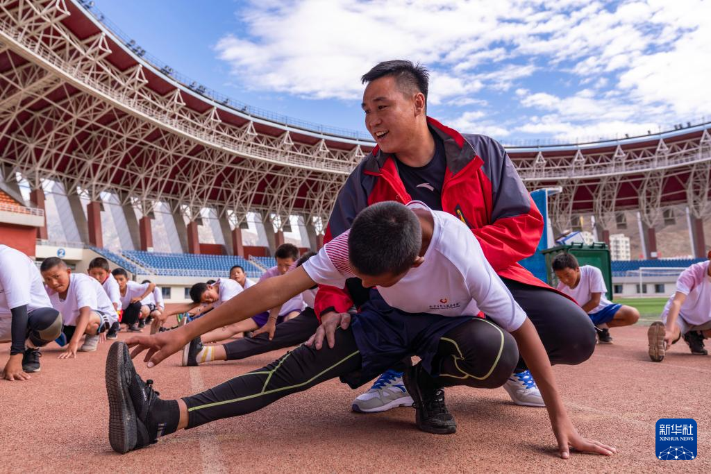 資料圖片:2019年6月22日,摔跤奧運冠軍張小平和競走奧運冠軍王麗萍在西藏自治區(qū)拉薩市文化體育中心為拉薩市業(yè)余體校的小運動員們上了一節(jié)訓(xùn)練課。圖為拳擊奧運冠軍張小平正在指導(dǎo)小運動員的壓腿動作。新華社記者 孫非 攝