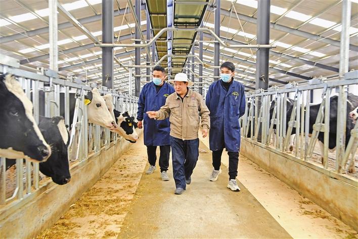 圖為近日,達(dá)孜區(qū)高標(biāo)準(zhǔn)良種奶牛養(yǎng)殖示范中心畜牧獸醫(yī)姜玉亮帶領(lǐng)新員工巡檢牛場。記者 李洲 攝
