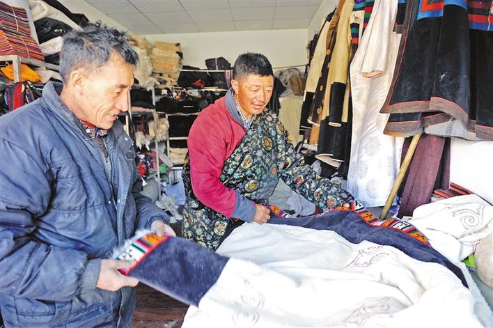 走進位于縣城的普保鎮(zhèn)色林錯農(nóng)畜產(chǎn)品銷售基地,嘎瑪平措正在和徒弟次仁桑波制作藏裝。不大的房間里,掛滿藏裝、藏帽和羊皮襖等手工制品。
