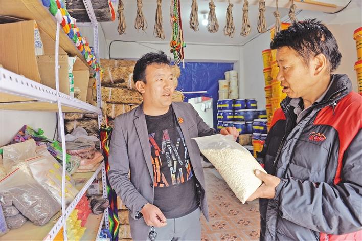 巴青縣雅安鎮(zhèn)產(chǎn)業(yè)合作社社員在給鎮(zhèn)黨委書記遲拉(左)介紹特色產(chǎn)品銷售情況。