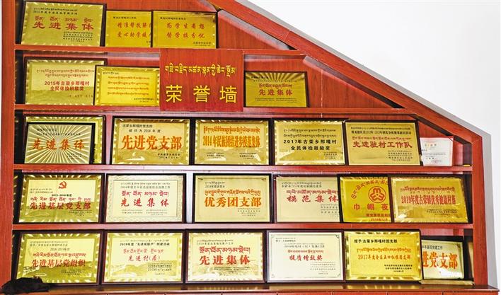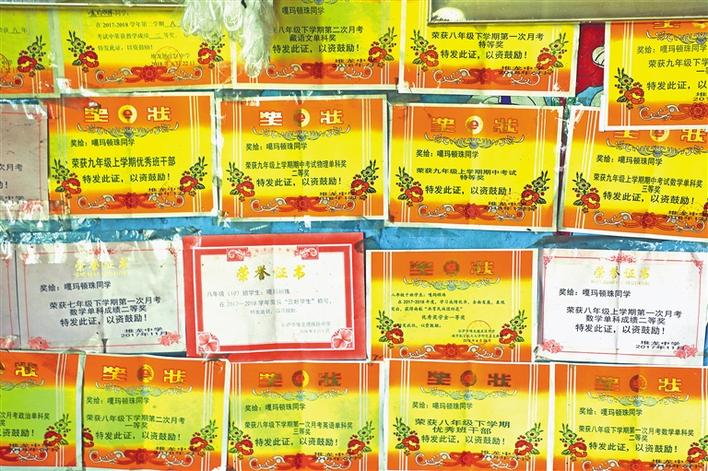 那嘎村脫貧戶(hù)扎西多吉家的獎(jiǎng)狀墻。
