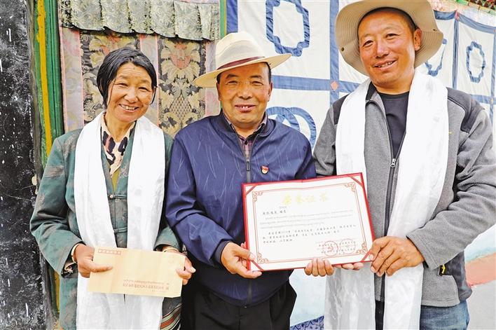 那嘎村黨委書(shū)記嘎瑪扎西(中)為脫貧戶(hù)次仁達(dá)瓦一家頒發(fā)榮譽(yù)證書(shū)。