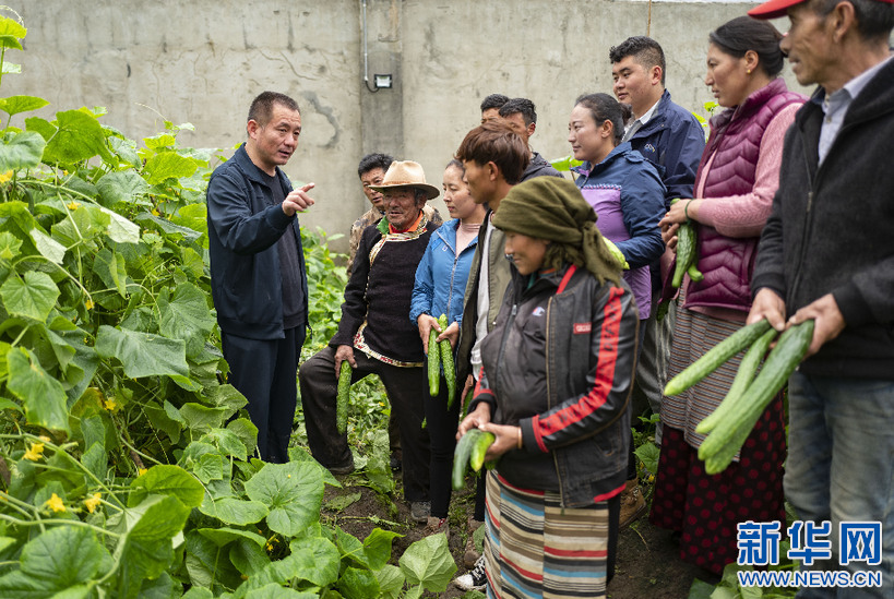 7月30日,西藏自治區(qū)供銷合作社社有企業(yè)負(fù)責(zé)人趙全(左一)給當(dāng)?shù)厝罕娭v解蔬菜種植知識(shí)。新華社記者 普布扎西 攝