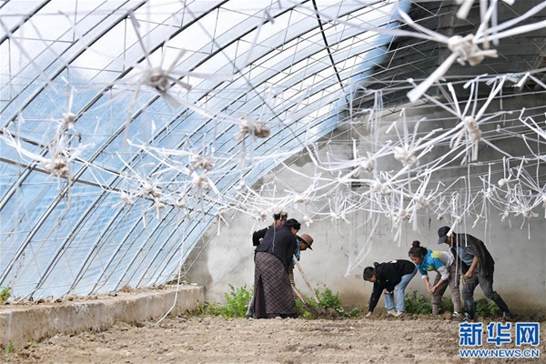 格桑旺姆(右三)與姐姐德吉卓瑪(右二)帶領(lǐng)工人在蔬菜大棚內(nèi)翻地,準備種新的蔬菜(8月3日攝)。