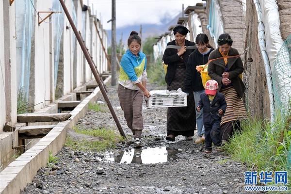 格桑旺姆(左三)和姐姐德吉卓瑪(左一)帶領(lǐng)雇傭的殘障村民巴珍(右一)搬運大棚出產(chǎn)的新鮮蔬菜(8月3日攝)。