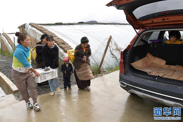 格桑旺姆(左三)和姐姐德吉卓瑪(左一)帶領(lǐng)工人將大棚出產(chǎn)的新鮮蔬菜抬上汽車,準備運往店鋪銷售(8月3日攝)。
