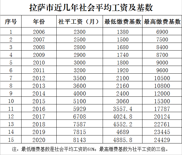 根據(jù)西藏自治區(qū)人社廳、西藏自治區(qū)財政廳、西藏自治區(qū)統(tǒng)計局《關(guān)于發(fā)布2020年上年度全區(qū)職工月平均工資的通知》(藏人社發(fā)〔2020〕82號)精神,2020年社會平均工資為8143元/月,新的繳費基數(shù)上下限及繳費標(biāo)準從2020年1月1日起執(zhí)行。
