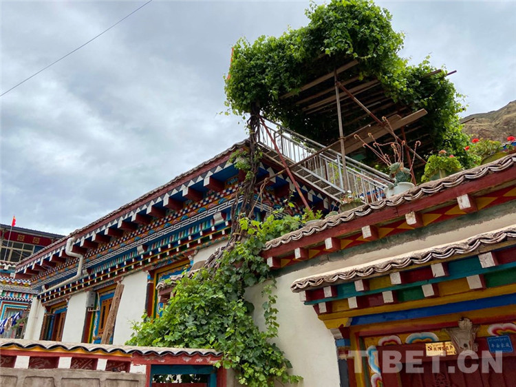 與同行者贊嘆一番,我的目光緩緩下移。在葡萄架側(cè)下方的房頂上,擺放著一排花盆。眾人皆知藏族愛花,即使在冬季,居民也會在陽臺養(yǎng)著幾盆花。如今進入雨季,主人把一盆盆花兒搬上房頂,與遠方的朋友共享好時光。