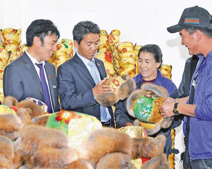 農(nóng)行山南扎囊縣支行客戶經(jīng)理(左二)來到扎囊縣扎塘鎮(zhèn)羊嘎村藏式帽子次仁金果農(nóng)民專業(yè)合作社對接產(chǎn)業(yè)扶貧項(xiàng)目。