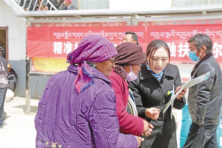 農(nóng)行山南扎囊縣吉汝?duì)I業(yè)所客戶經(jīng)理(前排站立者)在德吉林村講解精準(zhǔn)扶貧政策。