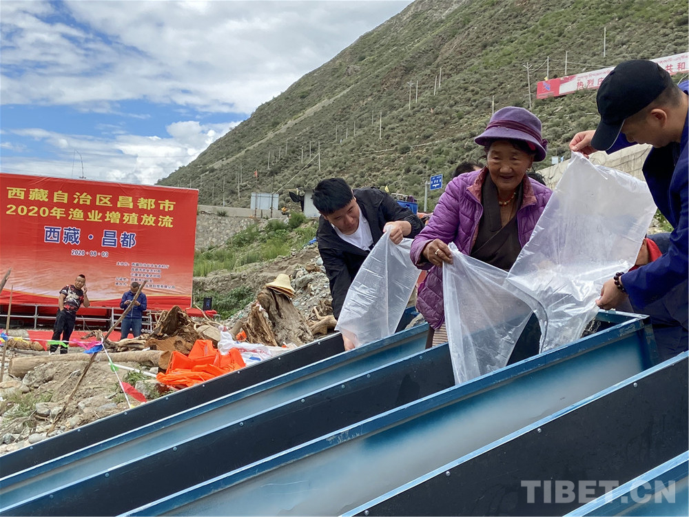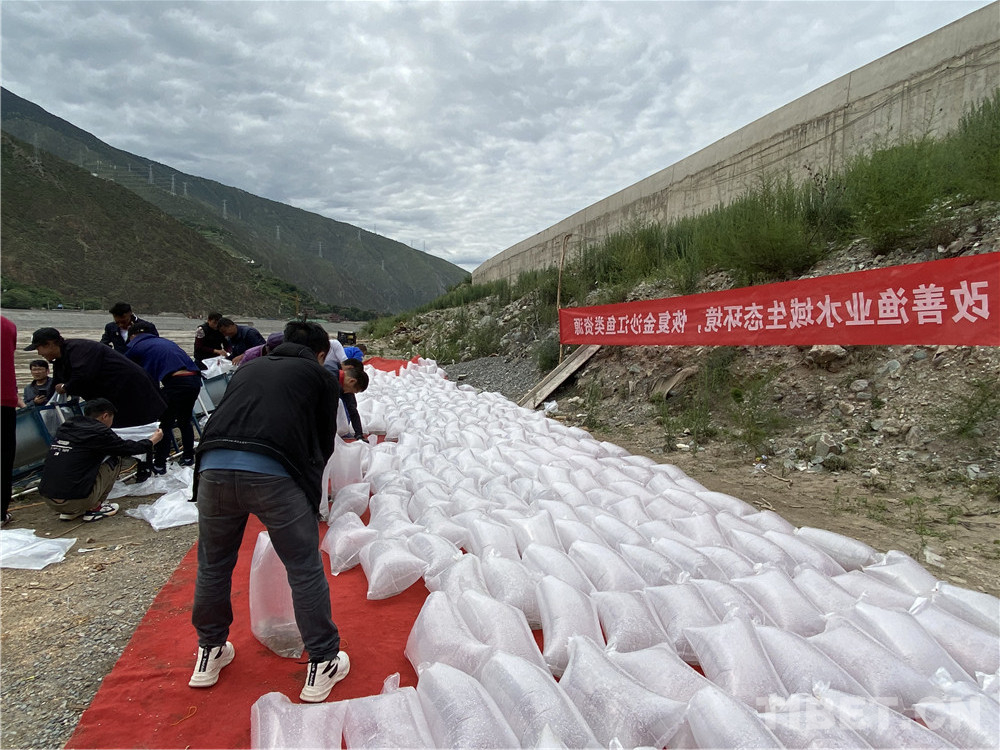 在工作人員協(xié)助下,老阿媽把一袋袋魚苗放入江中。據(jù)老阿媽說,當年十八軍進藏路過這里,帶的糧食不多,他們不向當?shù)厝苏骷Z,有些人餓得浮腫。江河中的魚兒好抓,但沒有一個戰(zhàn)士違反紀律去抓魚。藏族敬畏魚,不捕魚,不吃魚。解放軍尊重當?shù)仫L(fēng)俗,即使餓死也不抓魚充饑。