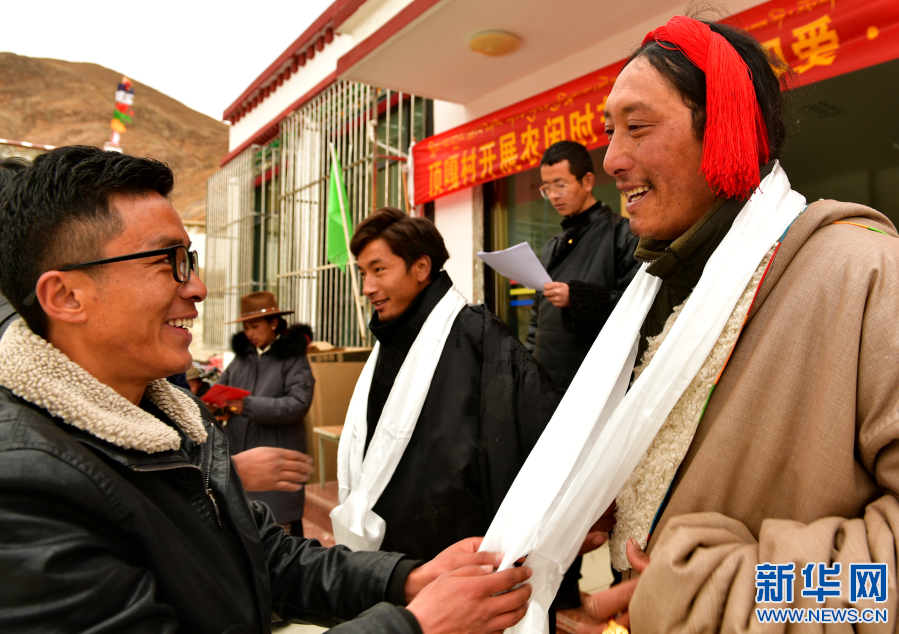 西藏拉薩市堆龍德慶區(qū)德慶鄉(xiāng)頂嘎村駐村第一書記扎西達(dá)杰(左)為參加文娛活動的獲獎村民頒獎并佩戴哈達(dá)(2019年2月28日攝)。新華社記者 張汝鋒 攝