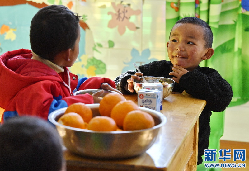西藏山南市貢嘎縣吉雄鎮(zhèn)紅星社區(qū)雙語幼兒園的孩子吃午餐(11月25日攝)。新華社記者 張汝鋒 攝