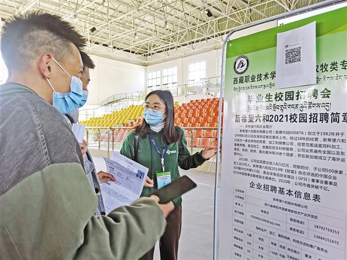 圖為西藏職業(yè)技術學院2021屆農(nóng)牧類專業(yè)畢業(yè)生校園招聘會現(xiàn)場,新希望六和股份有限公司工作人員向學生介紹招聘信息。記者 王莉 攝