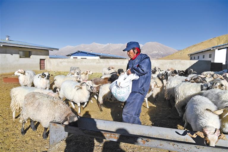 圖為聶拉木縣春都珠峰霍爾巴羊養(yǎng)殖農(nóng)民專業(yè)合作社的社員正在飼喂綿羊。記者 李洲 攝