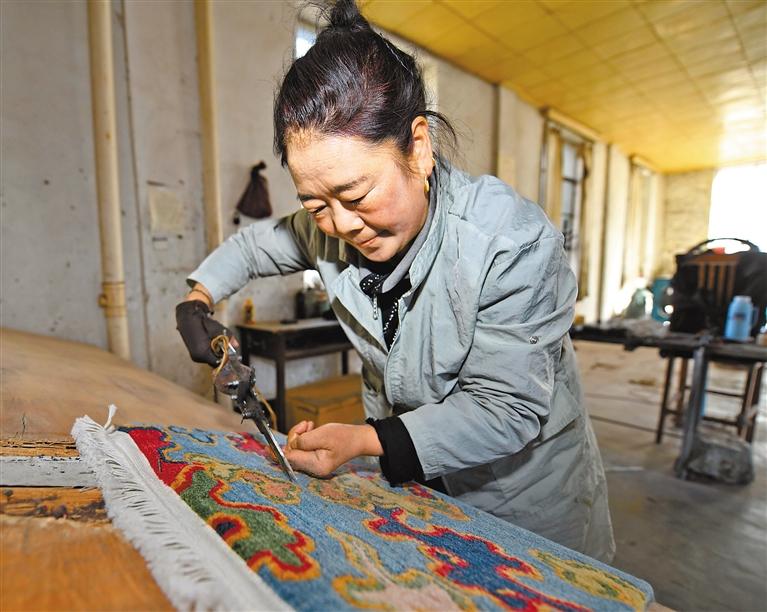 左圖為拉薩喀瓦堅(jiān)手工藏毯公司工人對(duì)藏毯進(jìn)行立體裁剪。[詳細(xì)]