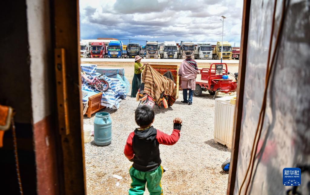 在雙湖縣多瑪鄉(xiāng)仲魯瑪村,運(yùn)輸家具的貨車整裝待發(fā)(7月13日攝,無(wú)人機(jī)照片)。新華社記者 晉美多吉 攝