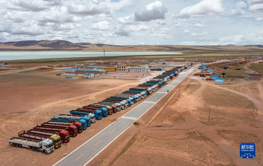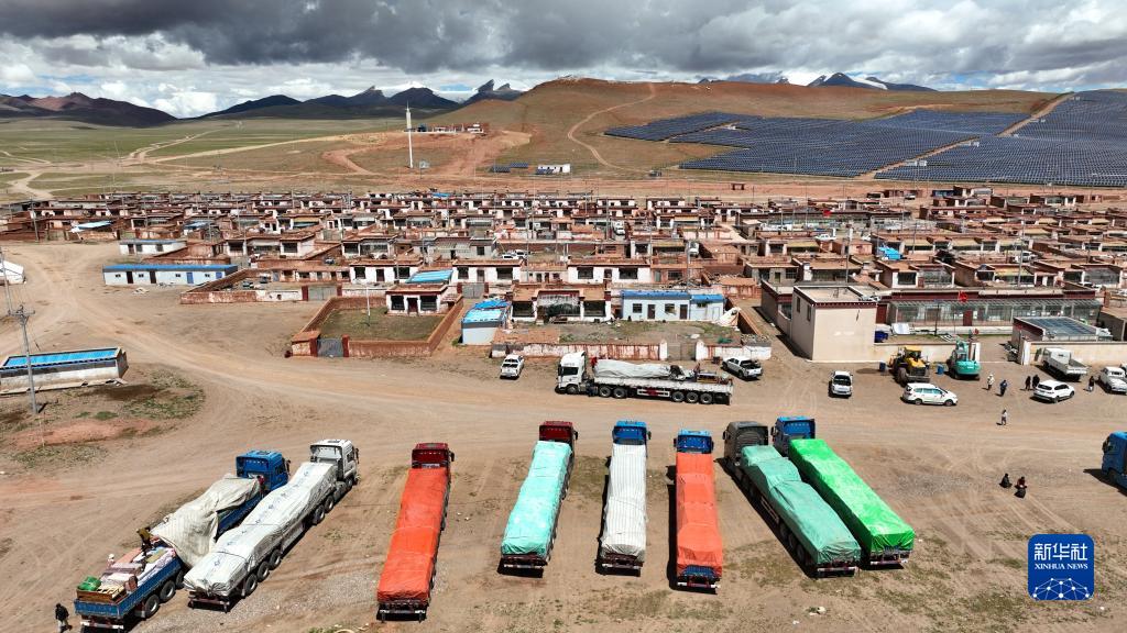 運(yùn)輸家具的貨車在雙湖縣多瑪鄉(xiāng)果根擦曲村集合(7月12日攝,無(wú)人機(jī)照片)。新華社記者 晉美多吉 攝
