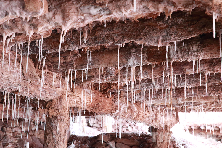 圖為鹽田房?jī)?nèi)頂部到處懸掛的鐘乳晶鹽 陳衛(wèi)國(guó) 攝