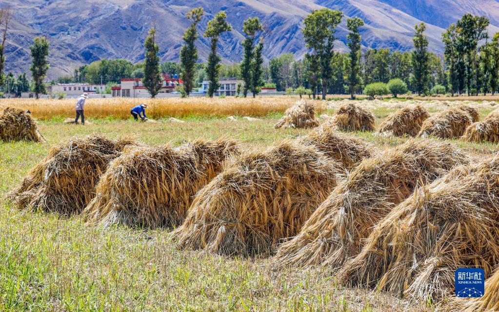 收割工作隊在林周縣邊林鄉(xiāng)當(dāng)杰村玉沖組搶收小麥(9月6日攝)。新華社記者 姜帆 攝