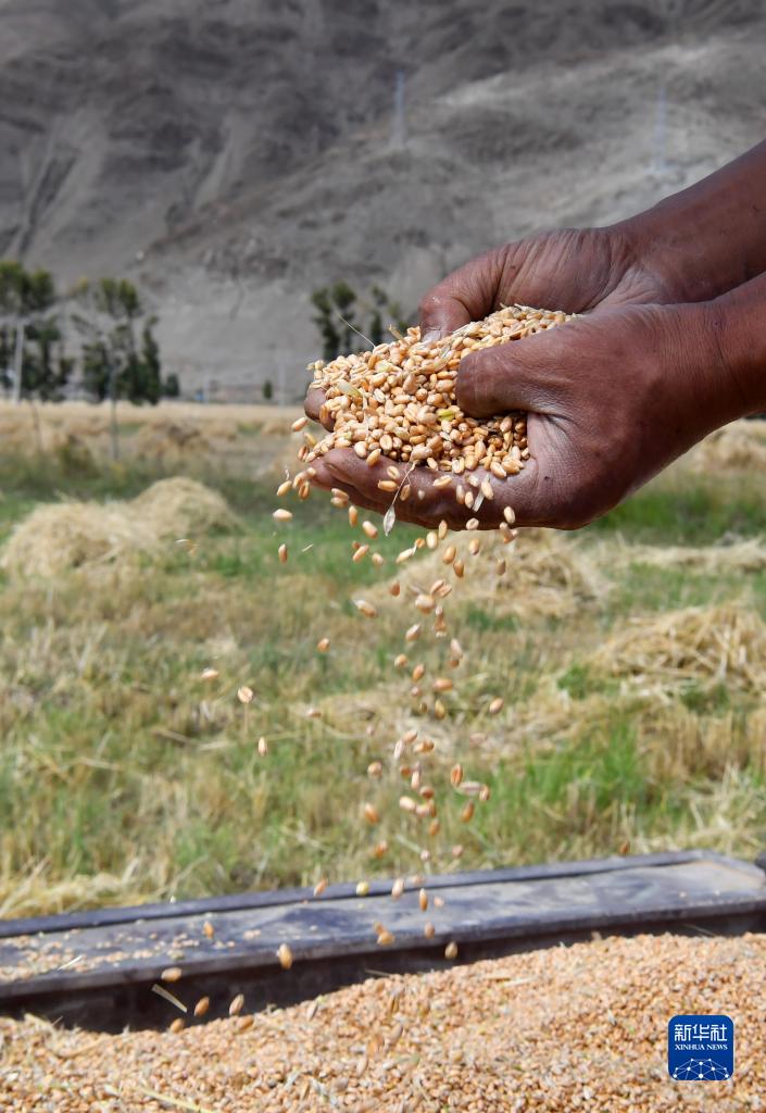 林周縣邊林鄉(xiāng)當(dāng)杰村玉沖組的村民在檢查收獲的小麥(9月6日攝)。新華社記者 覺果 攝