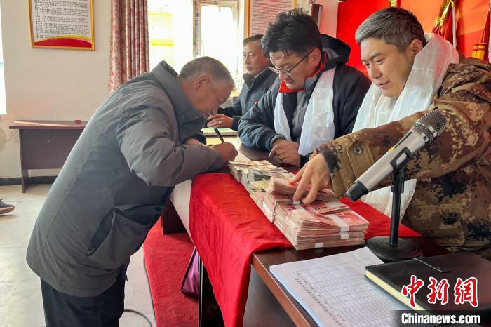 圖為2月19日,西藏那曲安多縣帕那鎮(zhèn)申格卡崗村牧民分紅?!≈袊F路青藏集團有限公司 供圖
