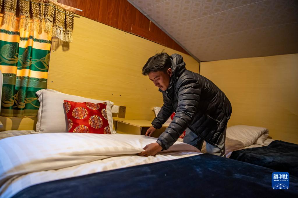 在珠峰游客大本營(yíng)的帳篷旅館,扎西次仁在整理床鋪(5月13日攝)。新華社記者 晉美多吉 攝
