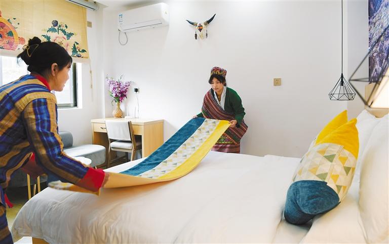 圖為林芝市墨脫縣背崩鄉(xiāng)巴登村村民在民宿中整理床鋪。記者 洛桑 攝