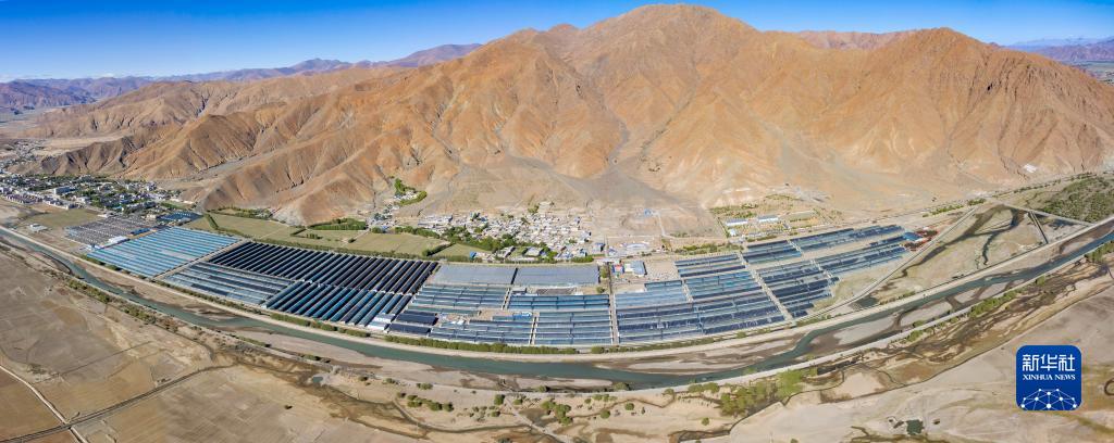 這是5月28日拍攝的白朗縣珠峰博覽園,目前園區(qū)共有高標(biāo)準(zhǔn)溫室大棚133座(無人機(jī)拼接照片)。新華社記者 姜帆 攝