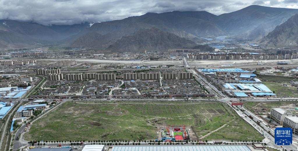 7月5日拍攝的拉薩市年產(chǎn)30萬噸啤酒建設項目奠基儀式現(xiàn)場(無人機照片)。新華社記者 晉美多吉 攝