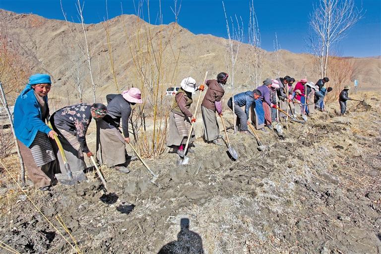 圖為山南市瓊結(jié)縣下水鄉(xiāng)的群眾在種植樹苗。(資料圖片)記者 次旺 洛桑 李洲 唐斌 攝