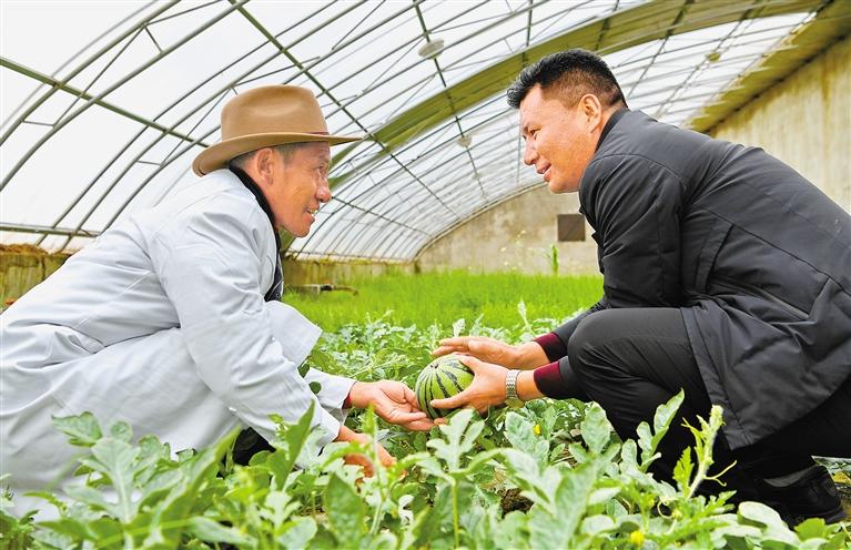 圖為措勤縣農(nóng)牧業(yè)技術推廣站站長吾金次仁(右)和措勤縣高原生態(tài)畜牧業(yè)現(xiàn)代化養(yǎng)殖一體化產(chǎn)業(yè)綜合基地合作社負責人扎西桑布在西瓜大棚里交流。 新華社記者 張汝鋒 攝