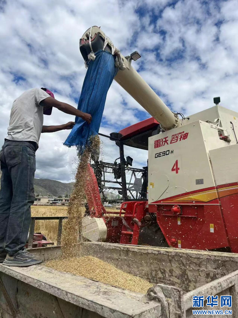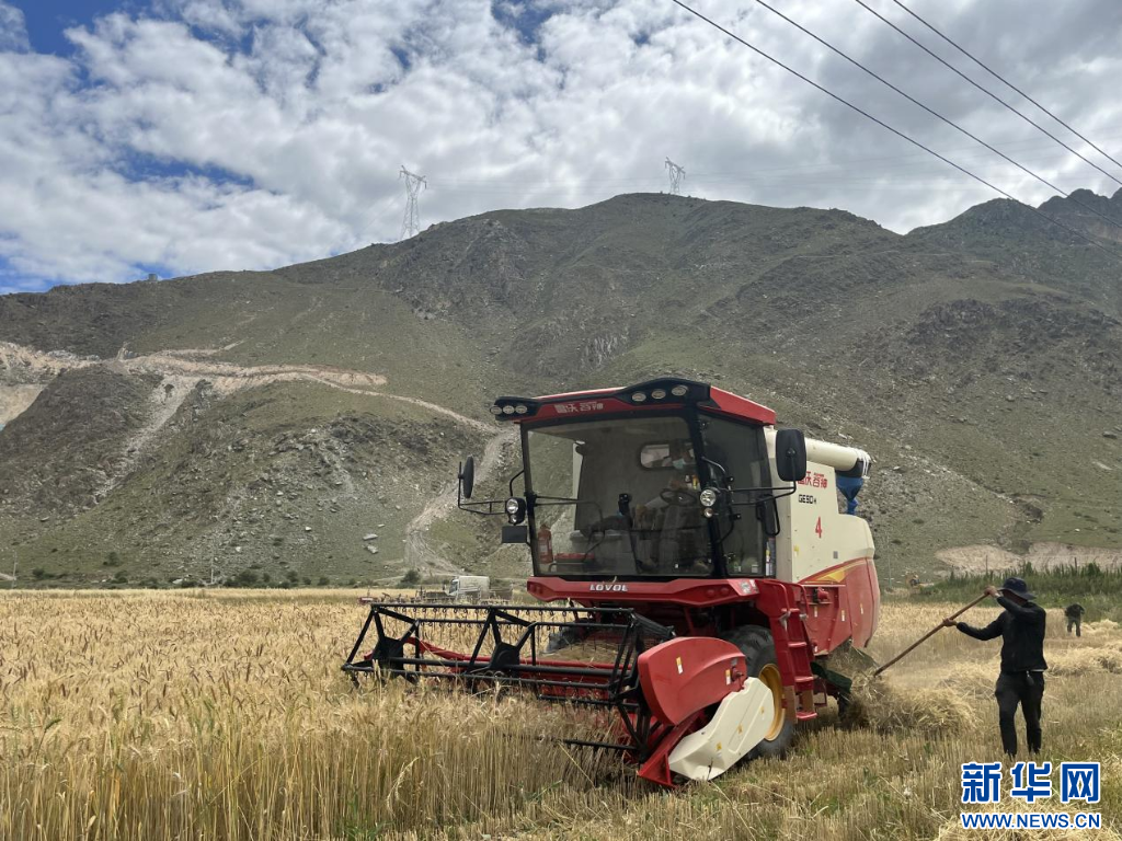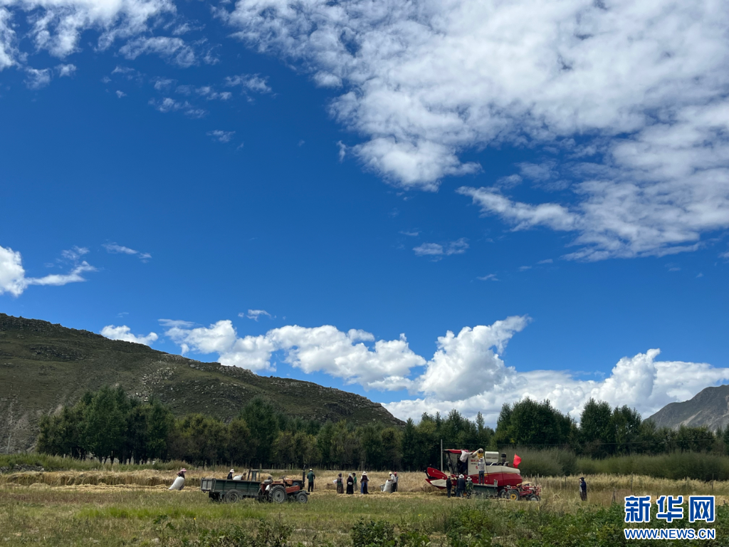 秋收時節(jié),西藏各地加快推進秋收工作。在西藏拉薩市達孜區(qū),金色的田野里聯(lián)合收割機、拖拉機和電動三輪車來回穿梭,收割、摘穗、秸稈粉碎、運輸……一片繁忙景象。