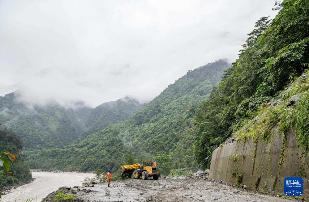在墨脫縣格當鄉(xiāng),工作人員在搶通道路(2023年10月12日攝)。新華社記者 孫非 攝