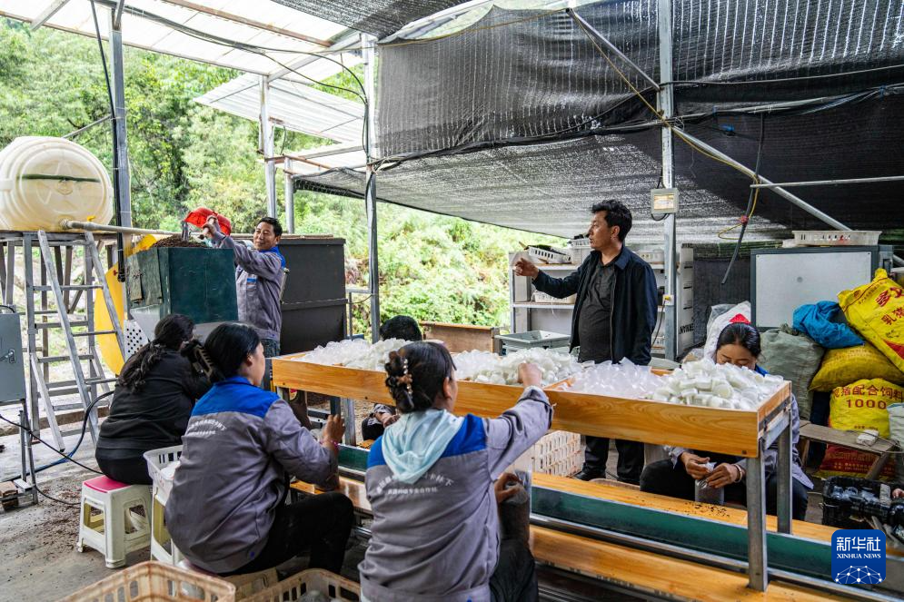 在墨脫縣格當鄉(xiāng)尼日卡林下資源種植合作社,貢秋次仁(右二)指揮工人生產(chǎn)菌包(2023年10月12日攝)。新華社記者 孫非 攝
