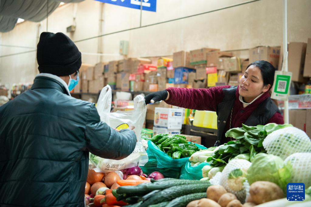 12月15日,羌域市場(chǎng)里,一名顧客在購買蔬菜。新華社發(fā)(旦增努布攝)